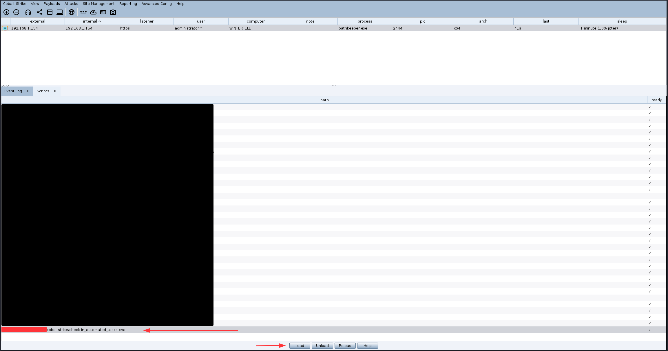 The image below shows where to load the beacon-check-in-automated-tasks.cna script in Cobalt Strike